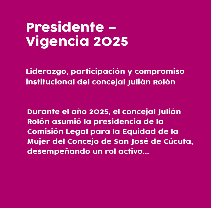 El concejal Julián Rolón ha liderado la Comisión de Legal para la Mujer, impulsando la prevención de violencias, la articulación institucional y recursos para la Casa Refugio, además de aportar a la construcción de la Política Pública de Mujer en Cúcuta.